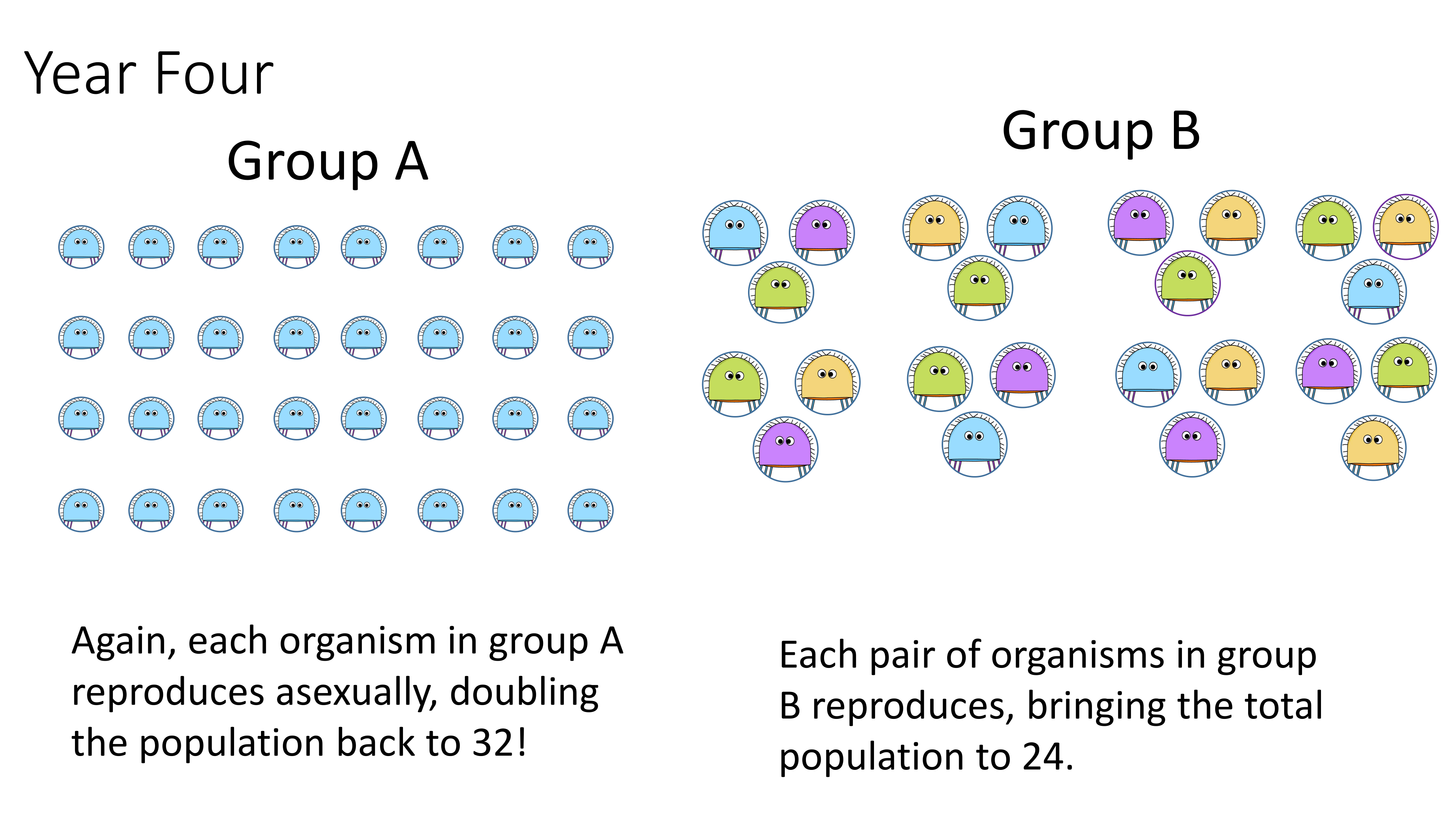 What is the population of group B at year 4?