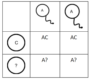 We know that the father does not have a p53 mutation, so both of his alleles are version A. The mother does have cancer caused by a p53 mutation, so we know she has at least one version of p53C. Since we are not sure what her second allele is, we mark it with a question mark.