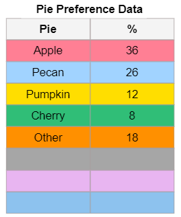 Change the graph type to "pie chart" and type in the graph title. Pie charts are graphs representing data as percentages. You will create a pie chart showing the preferences for a type of pie (forgive the pun!)