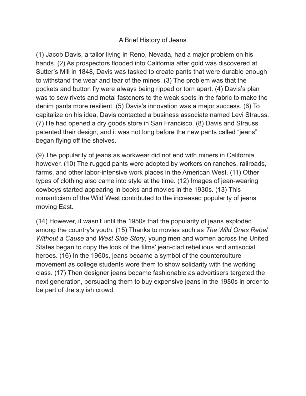 (6) To capitalize on his idea, Davis contacted a business associate named Levi Strauss. (7) He had opened a dry goods store in San Francisco.