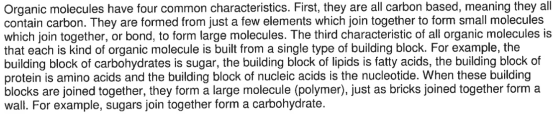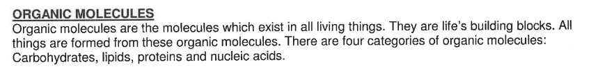 Name the four categories of organic molecules which form the basis of all living things.