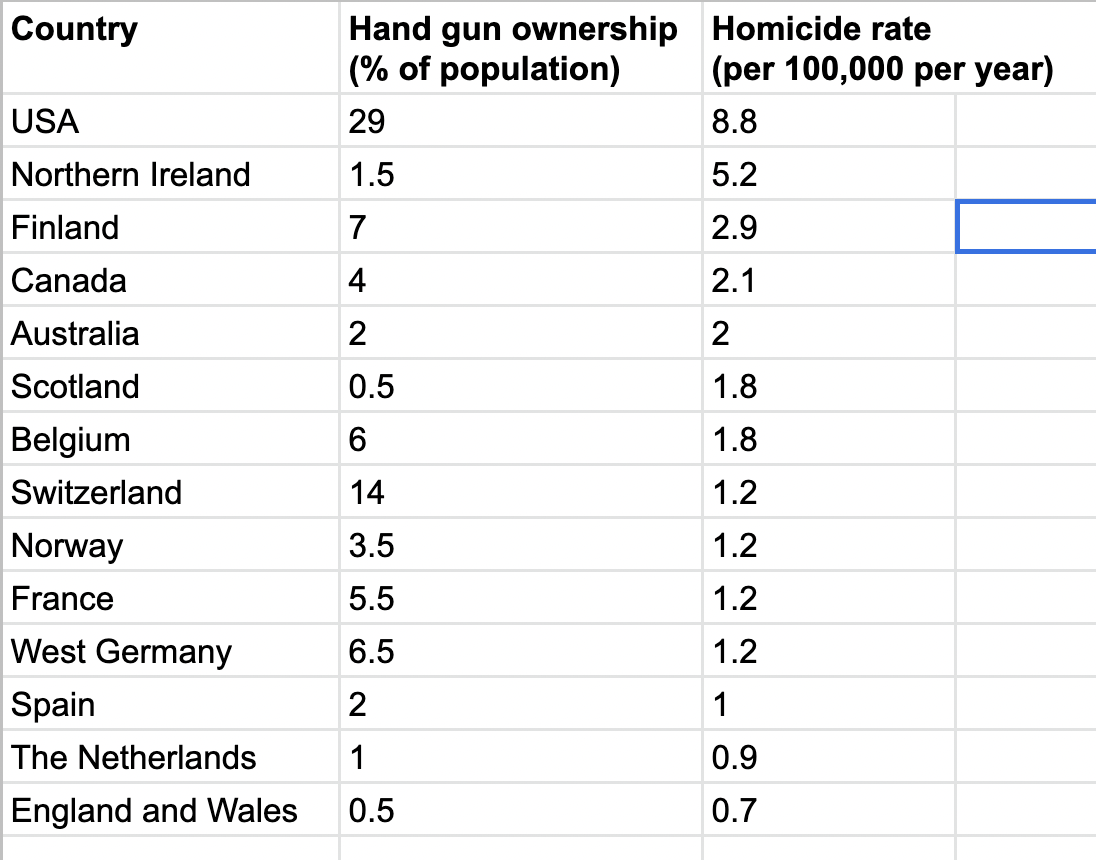 Discuss whether there is any correlation between a country's handgun ownership and homicide rate.