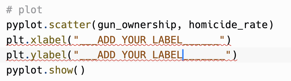 Enhance your scatter plot by labeling the x- and y-axes by adding two lines to your code: