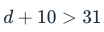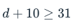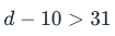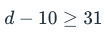 Suppose you had d dollars in your bank account. You spent $10, but have at least $31 left. Which of the following inequalities represents this situation?