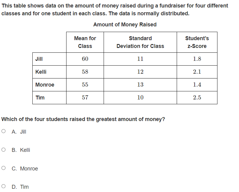 Use the z-score formula to find EACH student's actual amount of money raised (find x)...