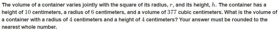 Use the cheat sheet to set up an equation. Remember that the square of the radius will be r^2 for this joint variation equation.