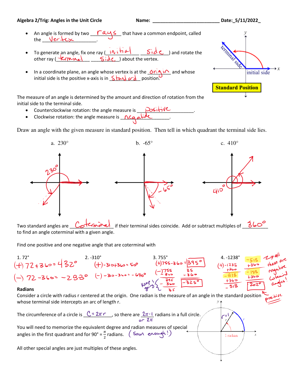 1/11/2023-HW Angles, Unit Circle Intro & SOL Prep