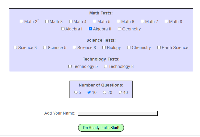 Click the jlab link above. Choose Algebra 2, Number of Questions: 10, and Click 'I'm Ready! Let's Start!'