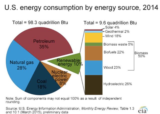 Using the graph above, what percentage of energy consumption was renewable in the USA in 2014 ?