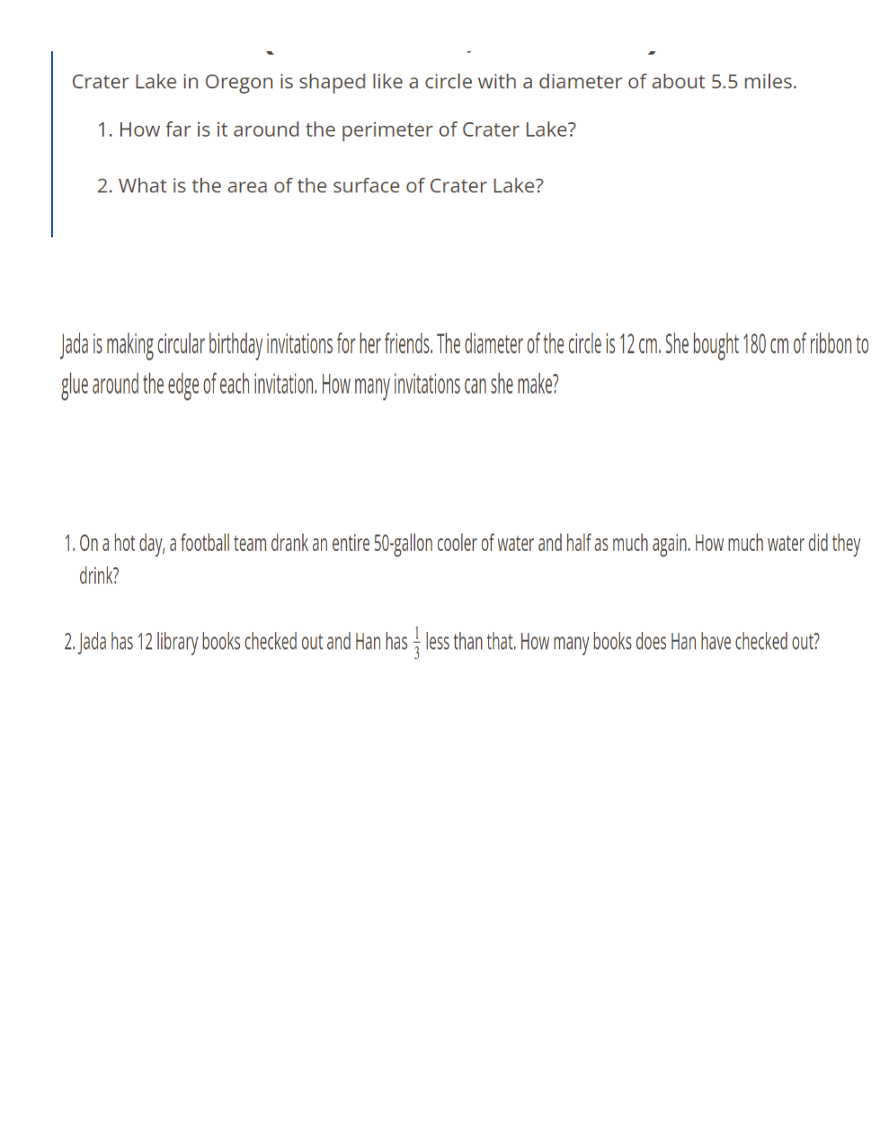 How far is it around the perimeter of Crater Lake? Use 3.14 for pi and include your units (miles).