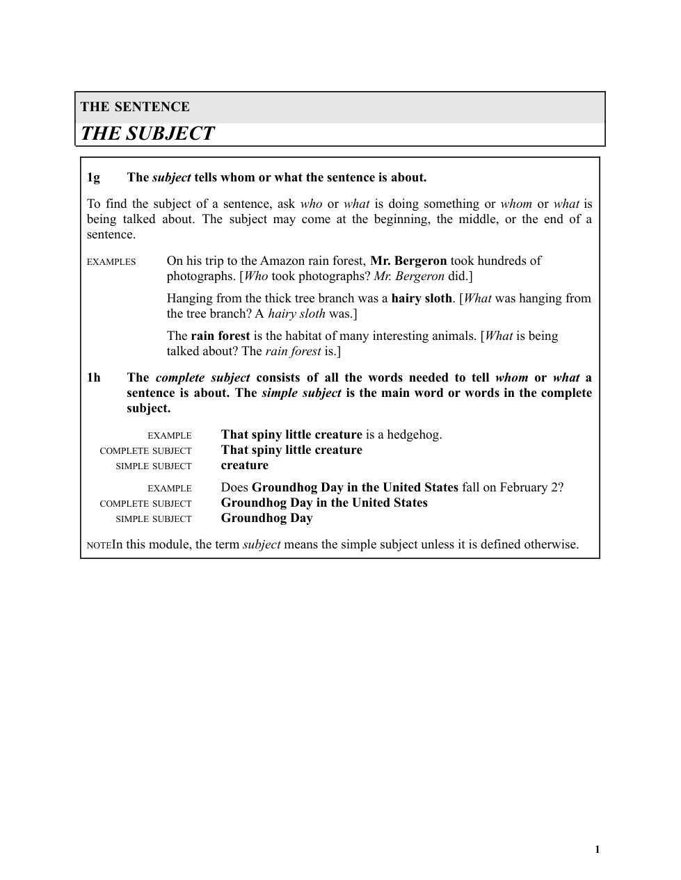 One use of a noun in a sentence is as a _______ , which tells whom or what the sentence is about.