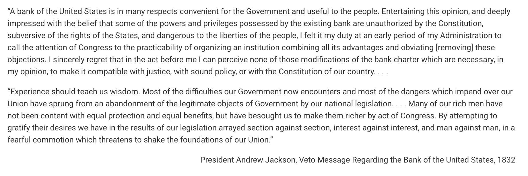 Andrew Jackson vetoed the recharter of the Bank of the United States partly because he believed that the bank