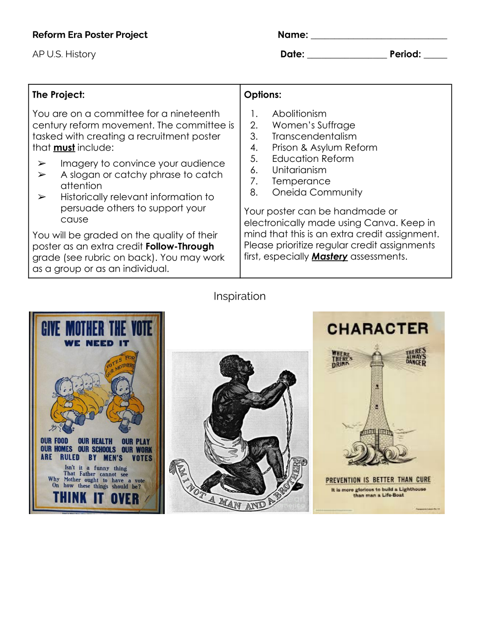 Any questions about the extra credit project on Reform Era Posters?
