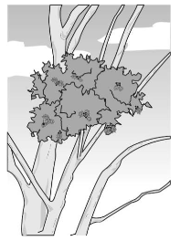 What is the ecological relationship between the mistletoe and the oak tree shown in the drawing? The mistletoe anchors itself into the tree and uses the tree's nutrients for its own benefit.