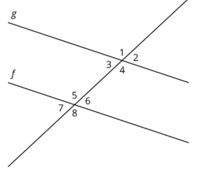 In the figure shown, lines f and g are parallel. Select all angles that are congruent to angle 1.