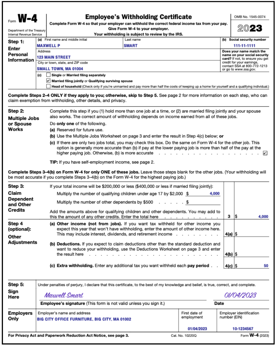 In this activity, you will explore a W-4 in more detail to understand its various components. Then, you will answer questions using the sample W-4 below.