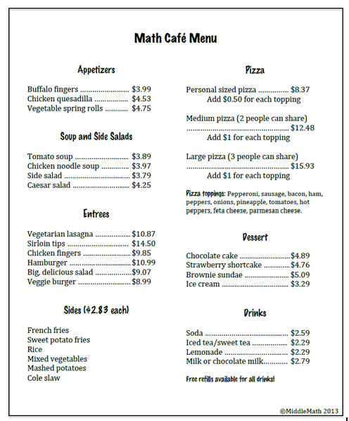You and your friends have decided to buy a meal at The Math Café. Each member of your group has at most $30 to spend. Don’t forget to leave enough money for tax and tip 😊 Answer the following questions below. Show all work.