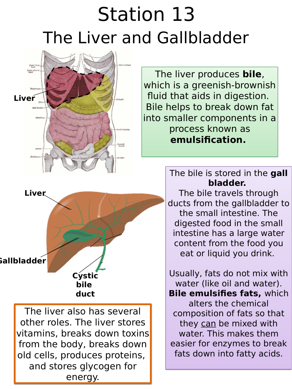 The liver stores _______, breaks down _______ from the body, breaks down old _______ and produces _______ . The liver also stores _______ for _______ .
