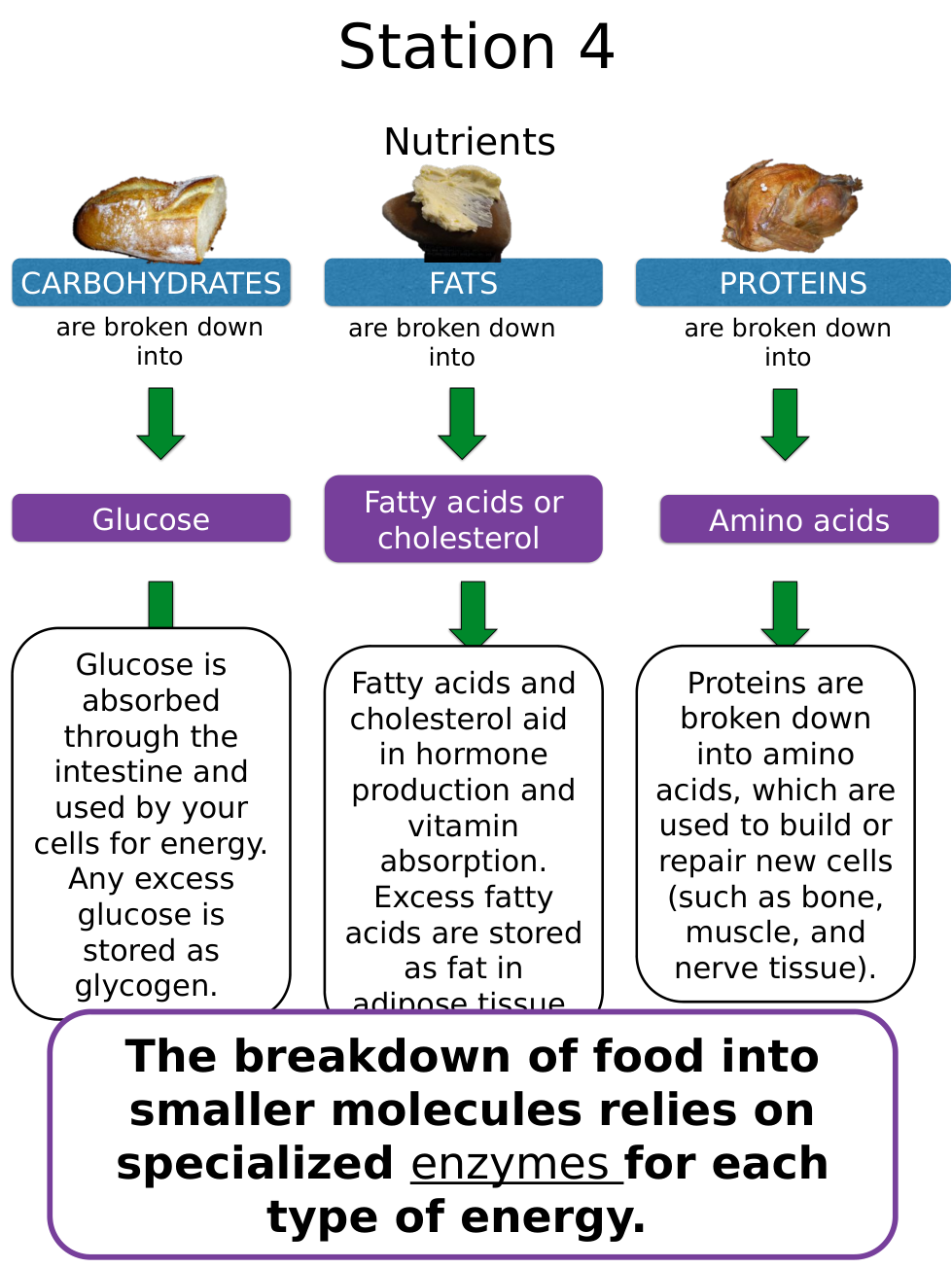 Proteins | arrow_right_alt | used to build or repair new cells |