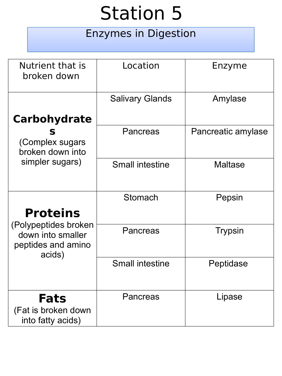 Fats are broken down into fatty acids in the _______ with the enzyme _______ .