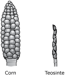 Humans first developed corn as a food crop over 8000 years ago. These early farmers produced corn by selectively breeding a wild grass called teosinte. The kernels of teosinte have a hard coating that makes them difficult for humans to eat. A key step in developing corn as a food crop was selecting individual plants that produced kernels without this coating so that they could more easily be used as a food source. The illustrations show the kernels on an ear of corn and the kernels on an ear of teosinte.