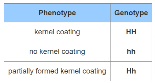 Corn and teosinte share the scientific name Zea mays. A single gene with two alleles codes for kernel coating (H) or no kernel coating (h) in Zea mays. To determine the inheritance pattern of this gene, scientists crossed teosinte that is true-breeding (homozygous) for kernel coating and domestic corn that is true-breeding for no kernel coating to produce offspring with partially formed kernel coatings. The three phenotypes and their genotypes are shown in the table.