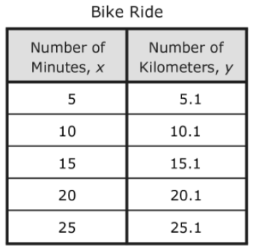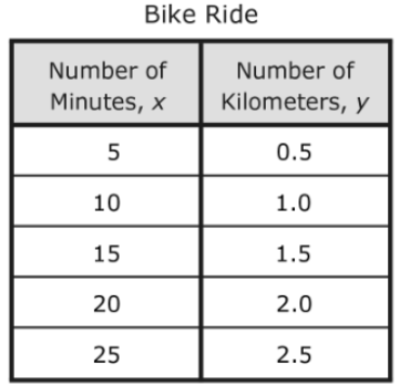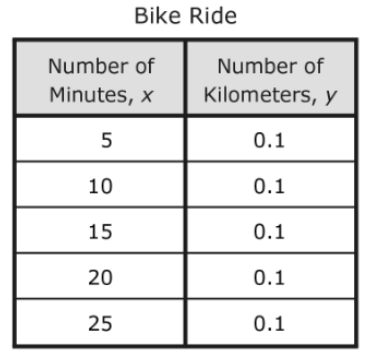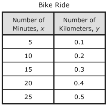 Pamela rode her bike at a constant rate of 0.1 kilometer per minute. Which table represents y, the number of kilometers Pamela roder her bike in x minutes?