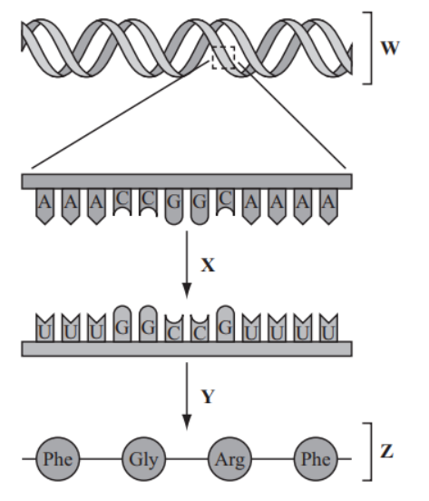 The arrow labeled Y represents the step in the process when mRNA is made into a protein chain. This process is called