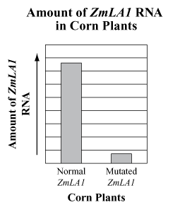 All corn plants contain the ZmLA1 gene. Some corn plants contain a certain mutation in the ZmLA1 gene. The graph below shows the amount of ZmLA1 RNA produced in plants with the normal gene and in plants with the mutated gene.Â