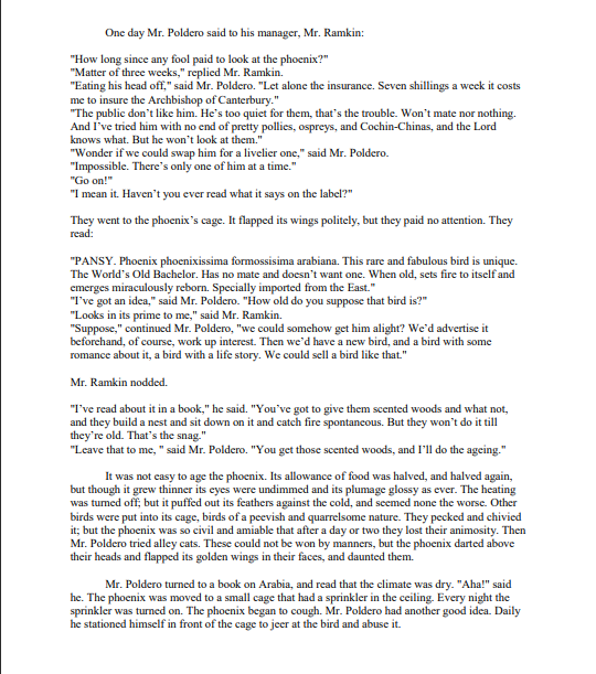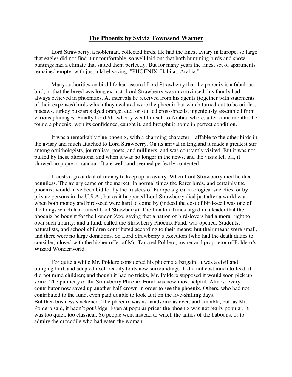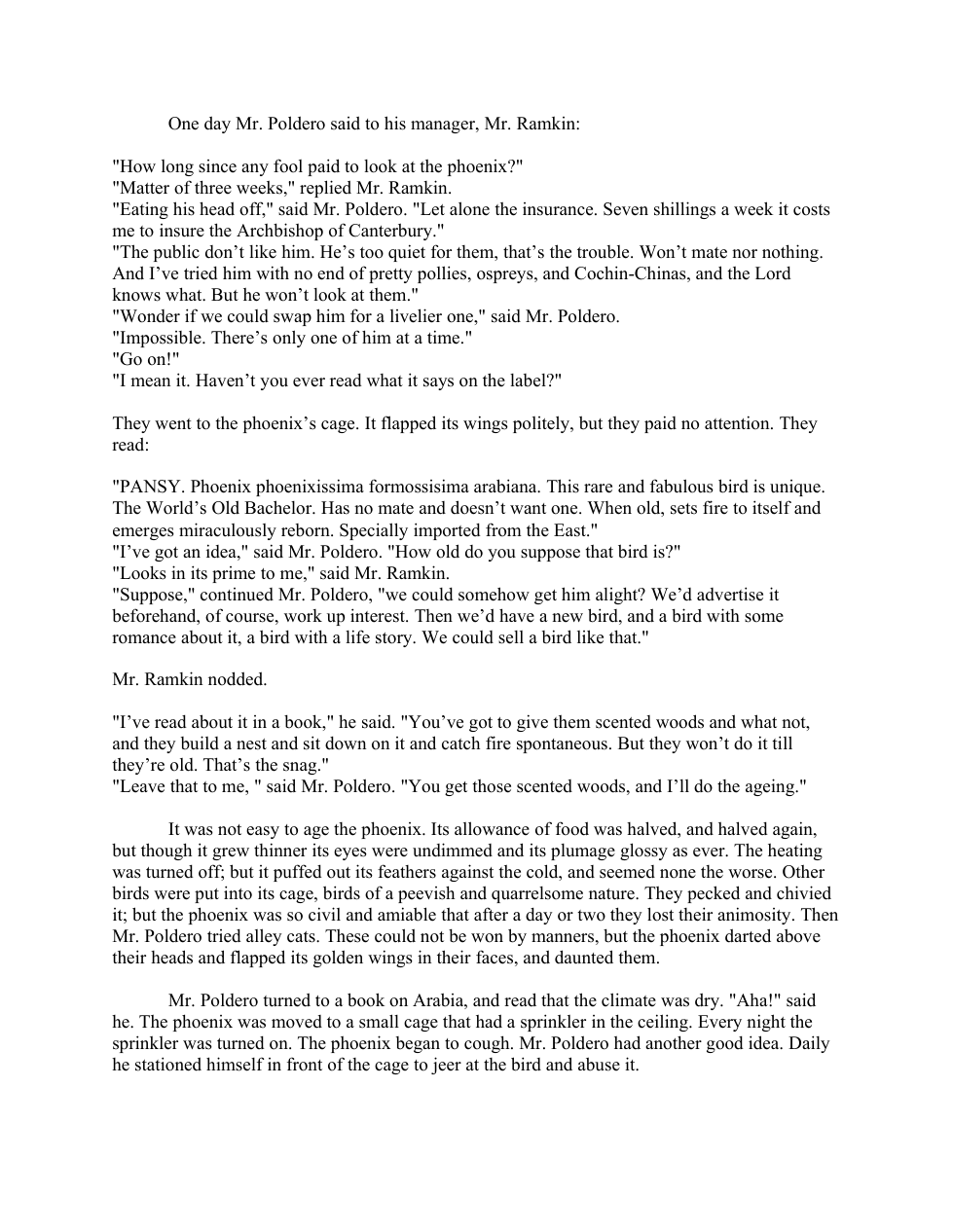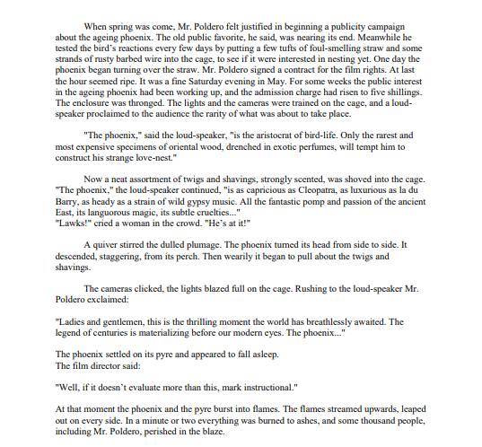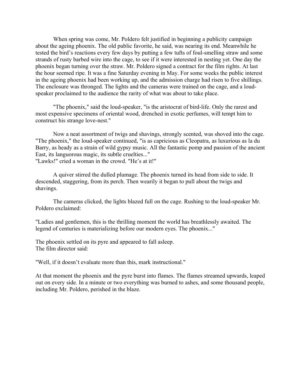 A quiver stirred the dull plumage. The phoenix turned its head from side to side. It descended, staggering, from its perch. then wearily it began to pull about the twigs and shavings.