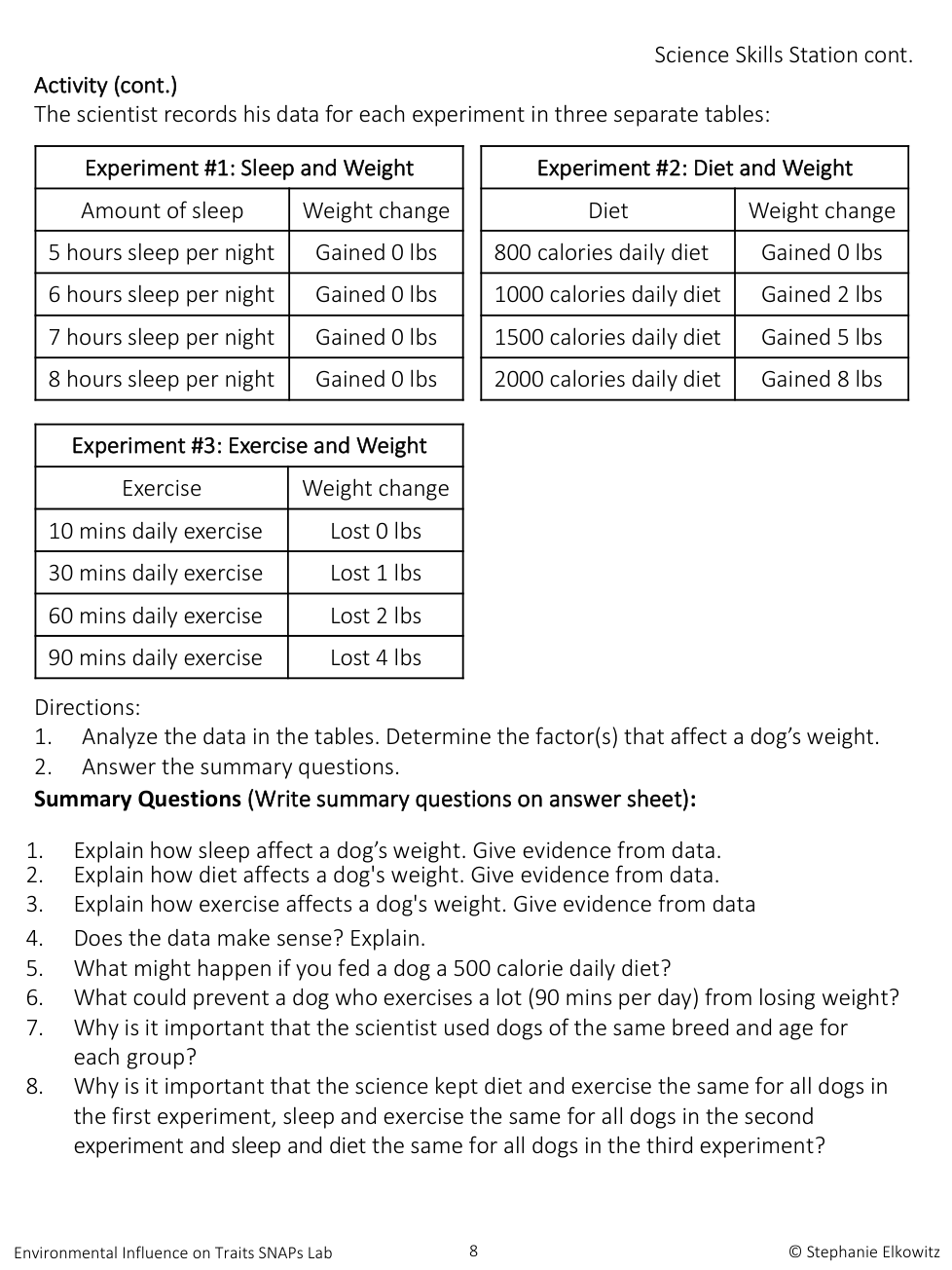 Look at experiment #1. How did sleep affect dog's weight. Give evidence from the data.