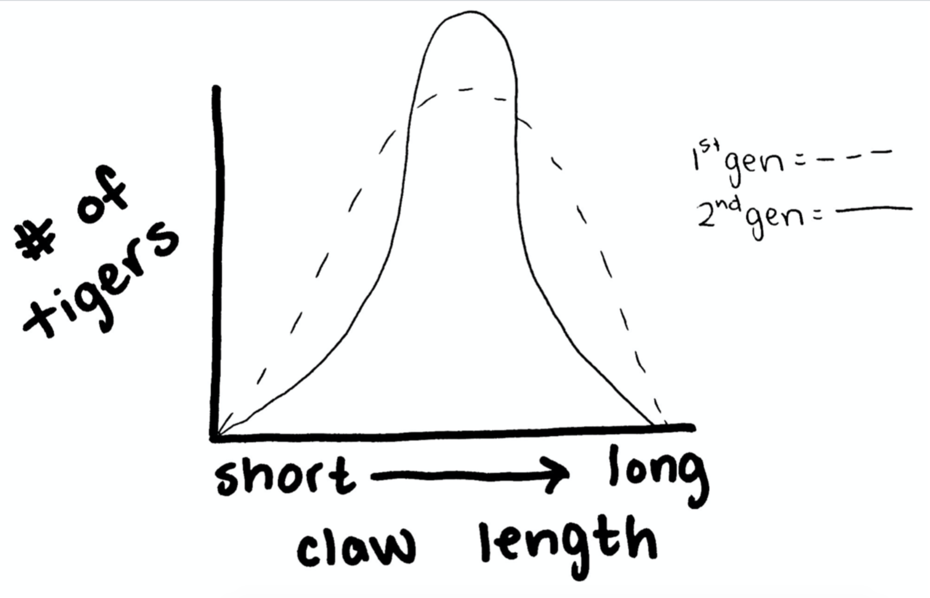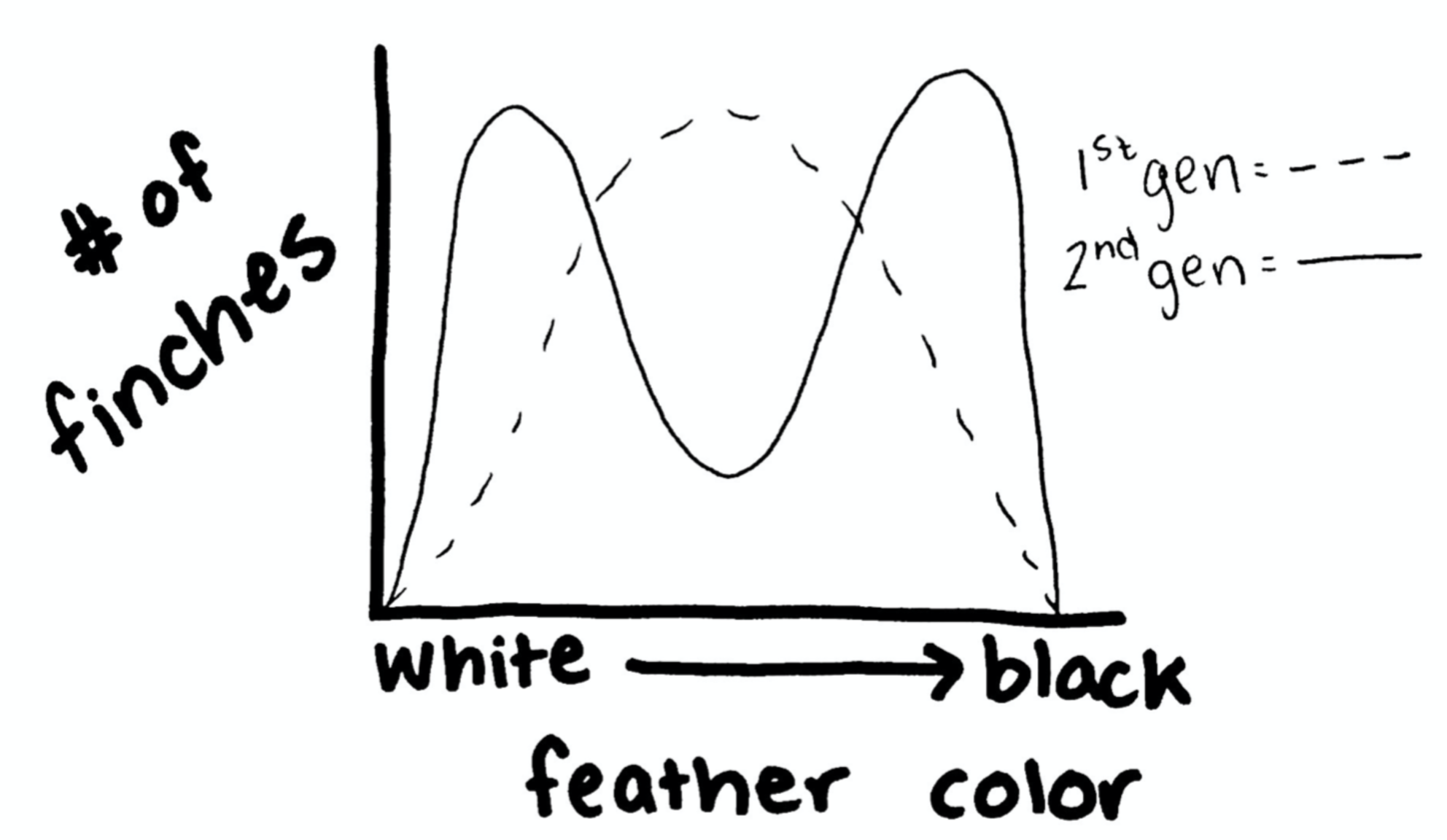 The following are examples of natural selection graphs. Identify the type of natural selection that is illustrated in the graph and make up a scenario that would fit that graph (you need to make sure you address the organism on the y-axis, the traits on the y-axis, environment, time, etc.) using vocabulary. FYI - My answers are about 7-8 sentences long.