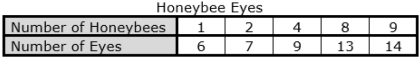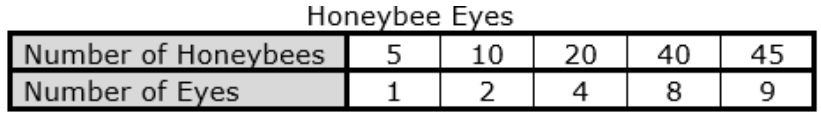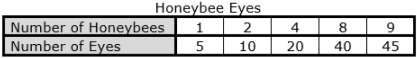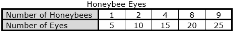 Patrick was doing a study on bees and discovered that all honeybees have 5 eyes. Which table shows the total number of eyes on different numbers of honeybees?