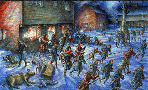 En observant cette image, quelle tactique de guerre est utilisée par les Français et les Canadiens contre ce village britannique durant la 2e guerre intercoloniale ?