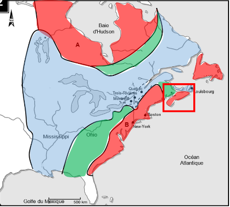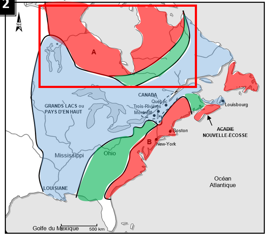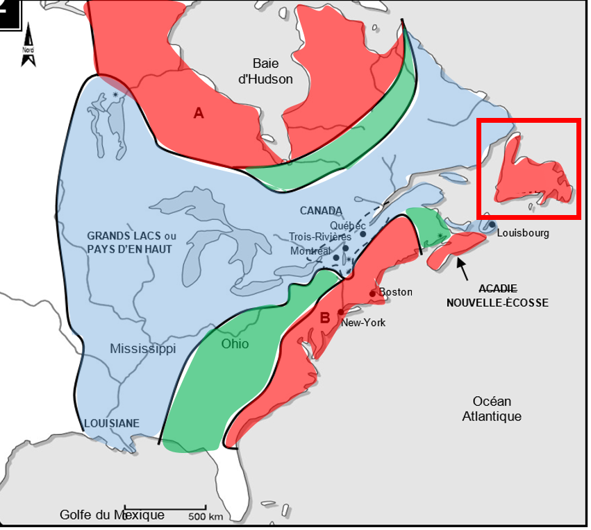 Quelle est le nom de la région (encadré sur la carte) devient contrôlé officiellement par la Grande-Bretagne avec le traité d'Utrecht ?