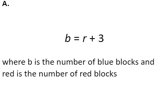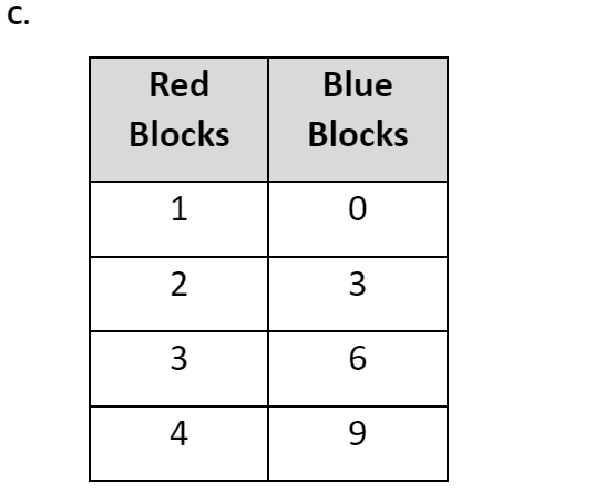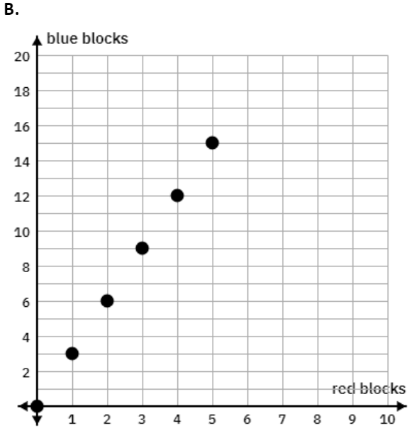Jonathan is creating a design with blue and red blocks. His design always has 3 times more blue blocks than red blocks. Which representation shows the possible numbers of red and blue blocks?