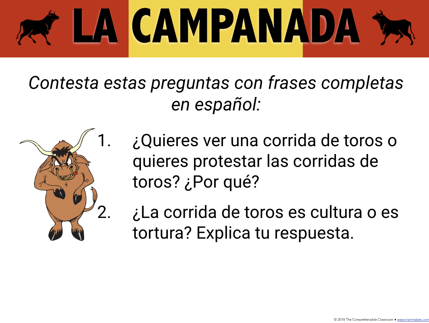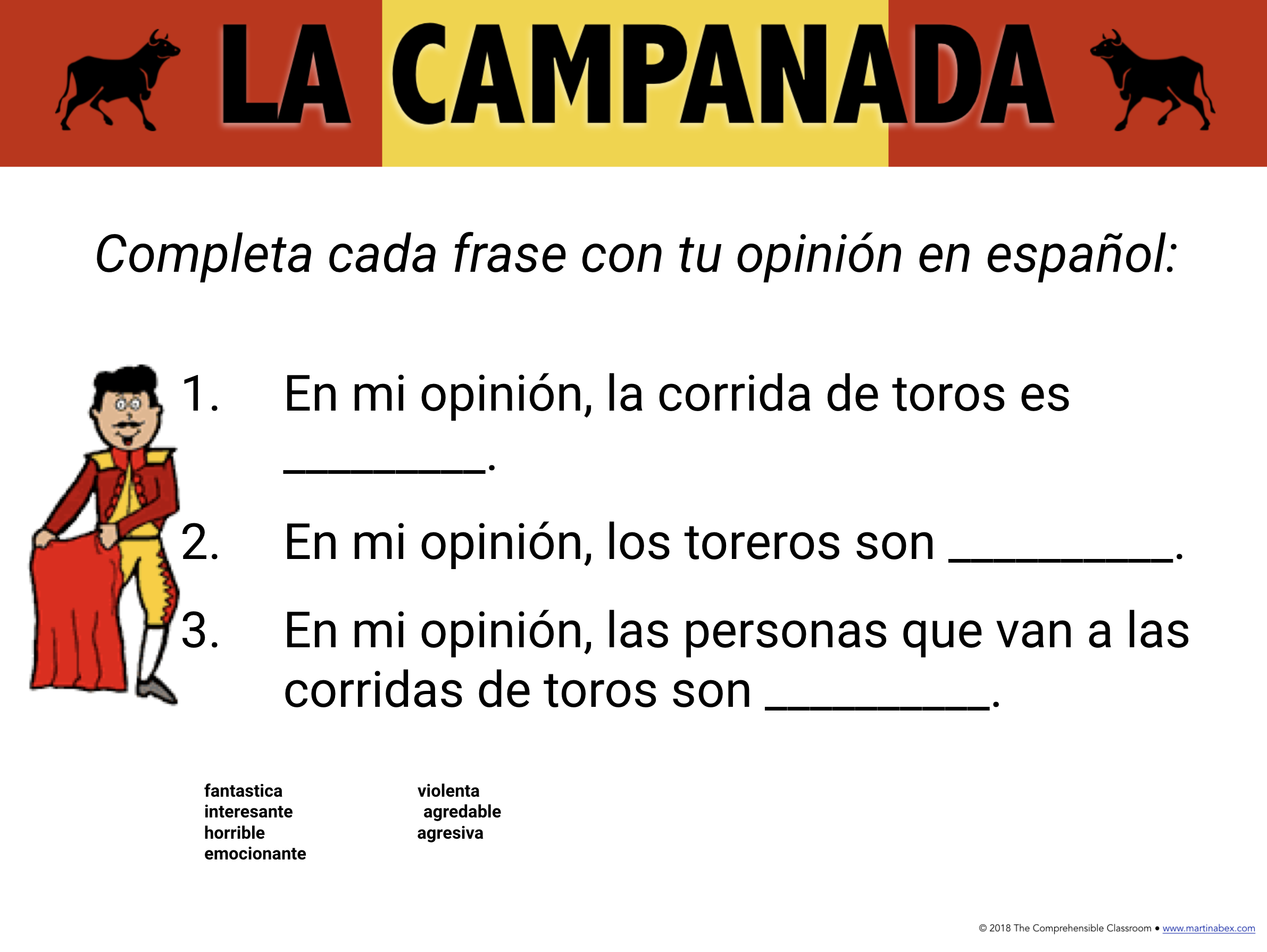 While you watch the bullfight, work with your team to write as many sentences as you can that describe what you see. Use the words on this page to help, but also use any other Spanish words that you know! In particular, try to use the bullfighting vocabulary that your teacher explains to you while you watch the video.