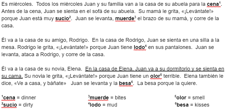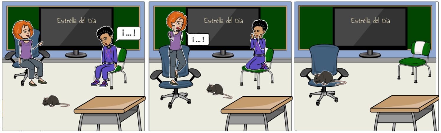 Write a short story based on the given illustration. Try to incorporate the Spanish words for “sits,” “stands,” and “yells,” along with any other words that help tell the story. Be creative! At minimum, you need to tell what happens in the photos.
