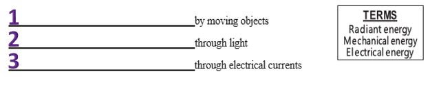 CHOOSE THE CORRECT TERM FOR EACH LINE. 1 Which term describes a way energy can move from place to place?What best fits on line 1?