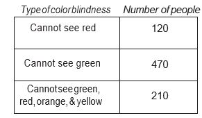 A survey was taken of 10,000 people to gather data about color blindness. Use the data table shown to create a bar graph.