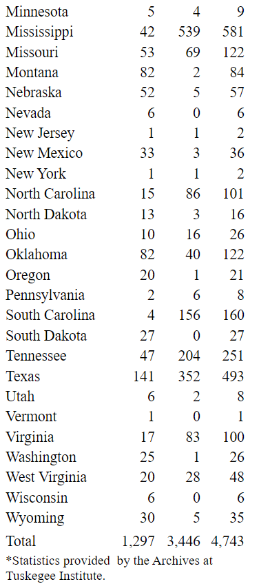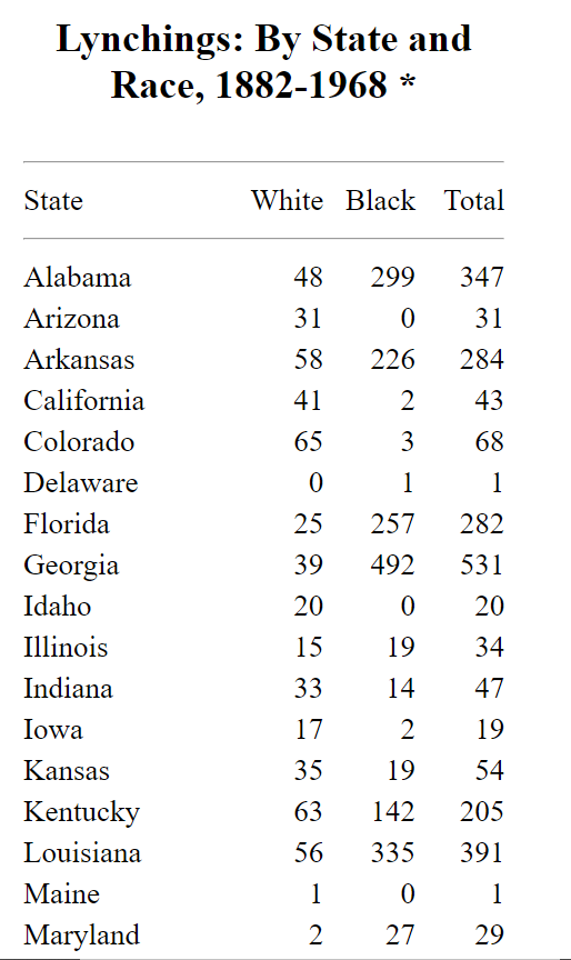 Examine the lynching records provided by the Tuskegee Institute. What do you notice/what stands out to you? Do you see any patterns? What questions do you have?