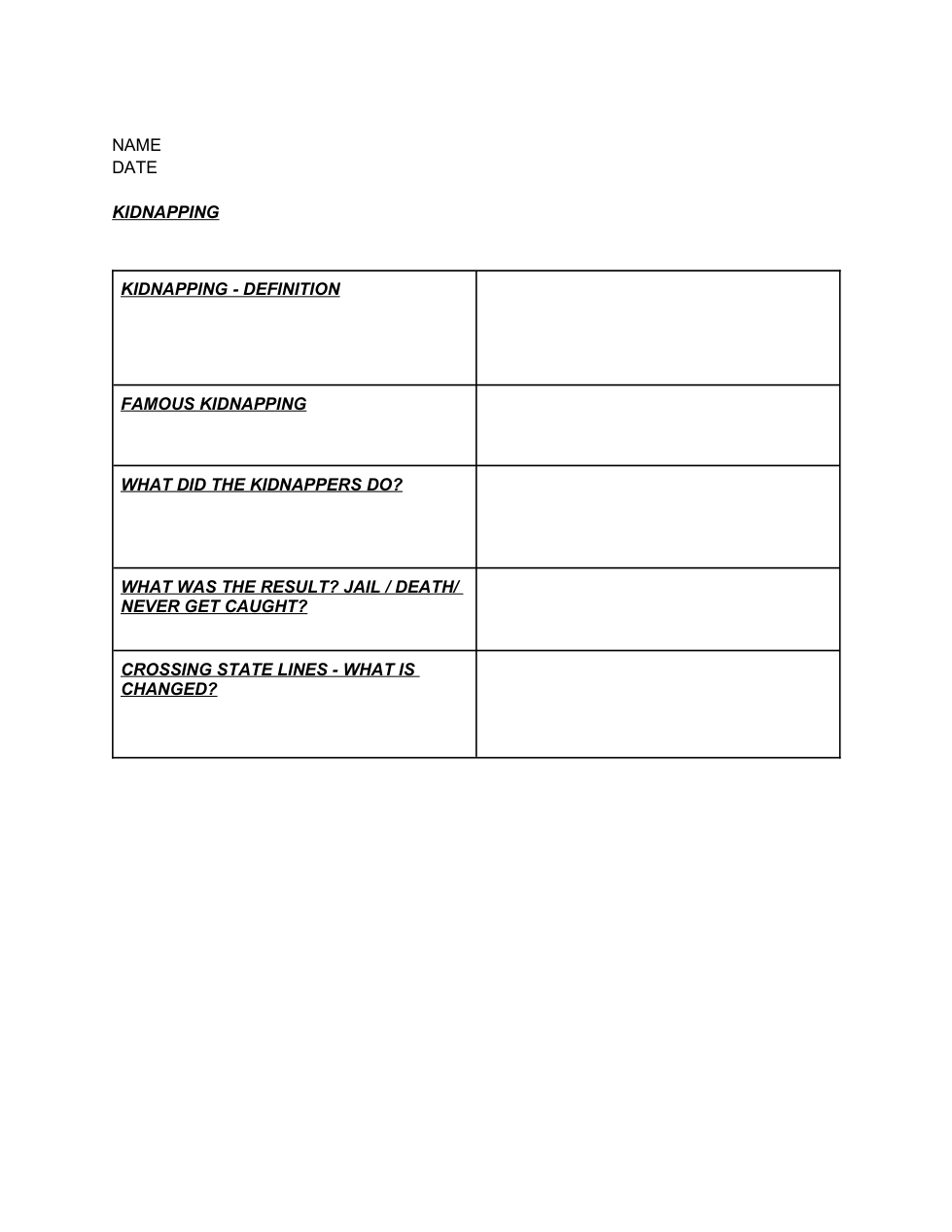 Research a kidnapping and fill in the answers to the sheet below. You may use any source to search. You can start with FBI.com.