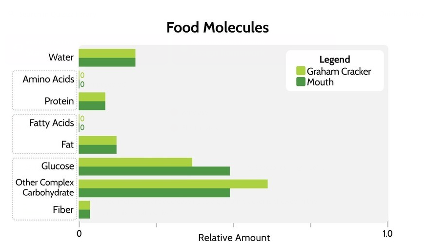 Which food molecules are decreasing as a graham cracker is chewed in the mouth and mixed with saliva?