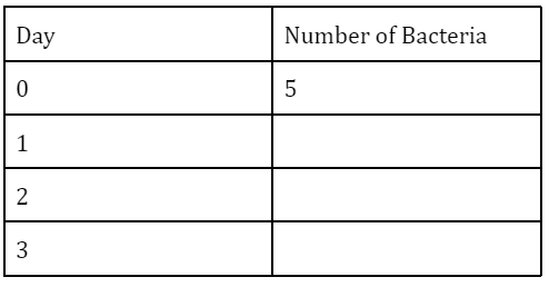 Lin counts 5 bacteria under a microscope. She counts them again each day for four days, and finds that the number of bacteria doubled each day—from 5 to 10, then from 10 to 20, and so on.