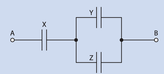 Find the charge on and potential difference across each capacitor in the figurewhen points A and B are connected to a battery of emf 12V.The capacitors all have a capacitance of 12pF.
