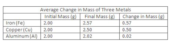 A student is trying to determine which type of metal will change the most after being exposed to water. The student obtains 2 gram samples of aluminum, iron, and copper. The student will run three trials for each type of metal. Each 2 gram sample is placed in separate glass beakers each containing 50mL of water. After the samples have been left in the beakers for two weeks, the student removes each metal from the water, and leaves them to dry on a paper towel for three days. After drying, the student takes the mass of each metal using an electronic balance. The new mass is recorded in a data table.
