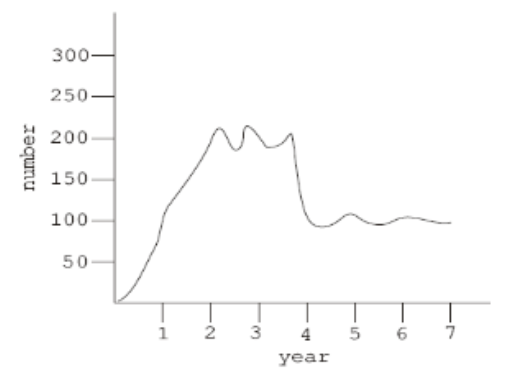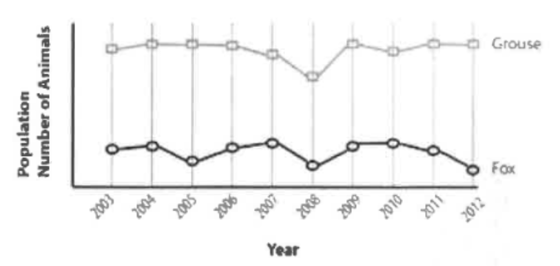 The graph below shows the populations, over several years, for two animals that share a habitat. Foxes are mammals that hunt for food, and grouse are birds, a common prey animal of foxes. According to the data, in which year did the population of foxes show a decrease that is most likely the result of a decrease in the availability of a source of food?