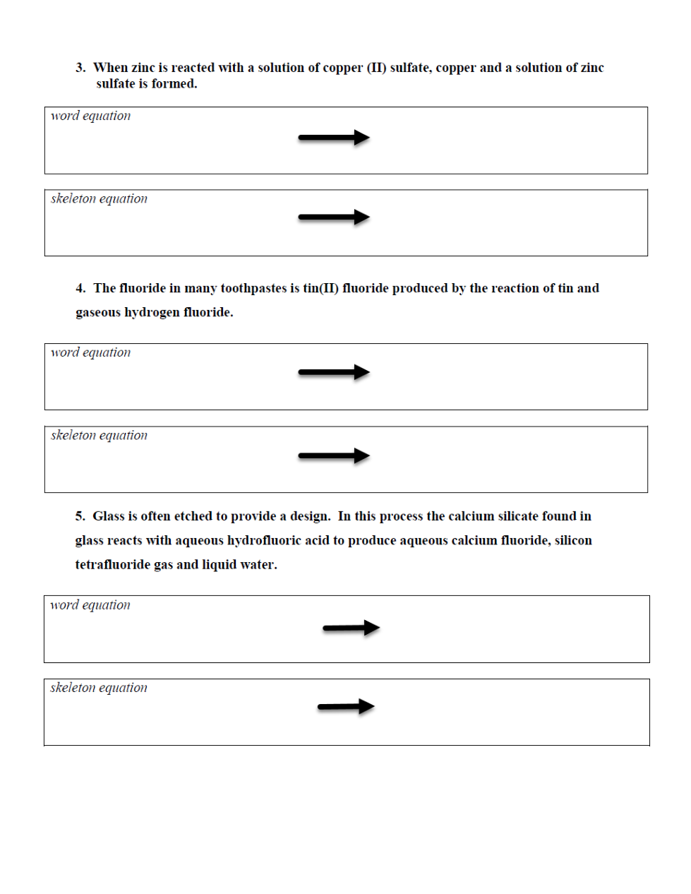 Glass is often etched to provide a design. In this process the calcium silicate found in glass reacts with aqueous hydrofluoric acid to produce aqueous calcium fluoride, silicon tetrafluoride gas and liquid water. Silicate = SiO4 with a -2 charge