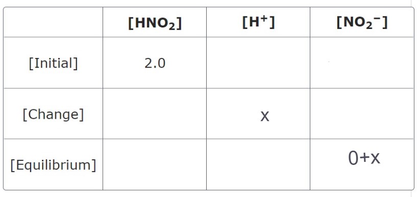 1.0 mol HNO2 is dissolved in water to make 0.50 liters of solution. Construct an ICE table to represent the problem.