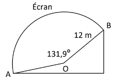 Le plan ci-dessous montre la vue de côté d’un écran courbe qui permet de projeter des films en3D. Calcule la longueur de l’arc intercepté par l’angle au centre AOB.